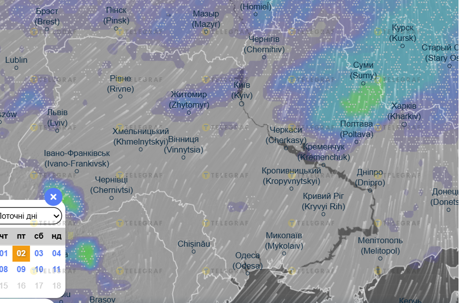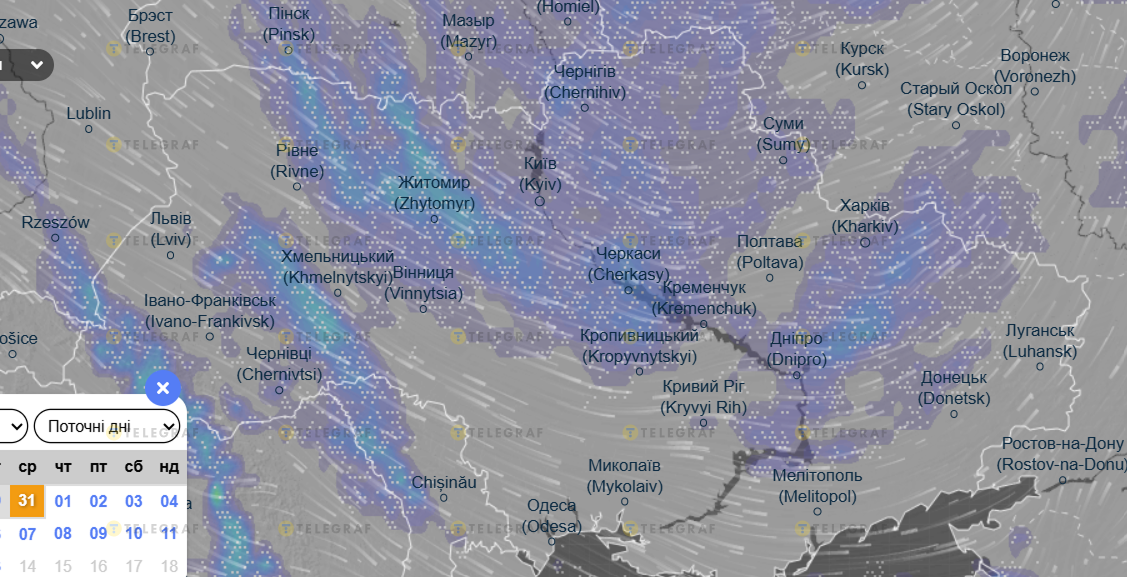Прогноз Ventusky дает несколько иную картину с осадками. По их данным, 1 января будет почти бесснежным, в то время как 31 декабря и 2 января Киев накроют части снежного фронта.