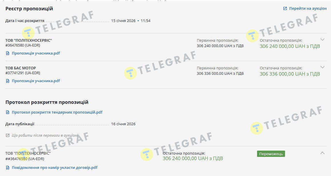Намерение поставить такое количество электротранспорта до конца текущего года изъявили два общества с ограниченной ответственностью — "Политехносервис" и "БАС Мотор". Первая фирма из Броваров, выпускающая троллейбусы под брендом PTS, вторая – из Луцка, представляющая бренд "Богдан". Оба участника предложили более низкую цену по сравнению со стартовой: "БАС Мотор" — на 8,2 тыс. грн., "Политехносервис" — на 104,2 тыс. грн.