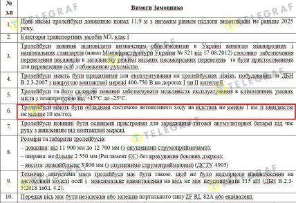 Поэтому победителем была признана броварская компания "Политехносервис" с ценой 19,1 млн грн/единица. В технических требованиях прописано, что должны быть поставлены новые троллейбусы длиной 11,96 м (по кузову) с низким уровнем пола, кондиционером, с системой автономного хода на расстояние не менее 1 км и с возможностью эксплуатации при температуре от +45 до -25 градусов.