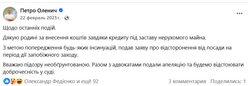 Мера пресечения/статус: ВАКС также отправлял Оленича под арест и давал возможность выйти на свободу, оплатив залог. Чтобы собрать 15 млн грн. семья якобы оформила кредит. Об этом сообщал экс-чиновник на своей странице в Facebook, отмечая, что написал заявление об отстранении от должности на период действия меры пресечения. Хотя на этом и так настаивала САП. Но шеф Оленича – Кличко – подошел к делу радикально и уволил своего заместителя с должности.