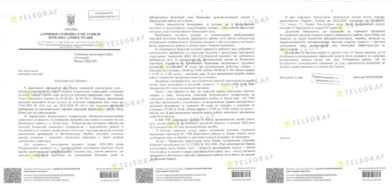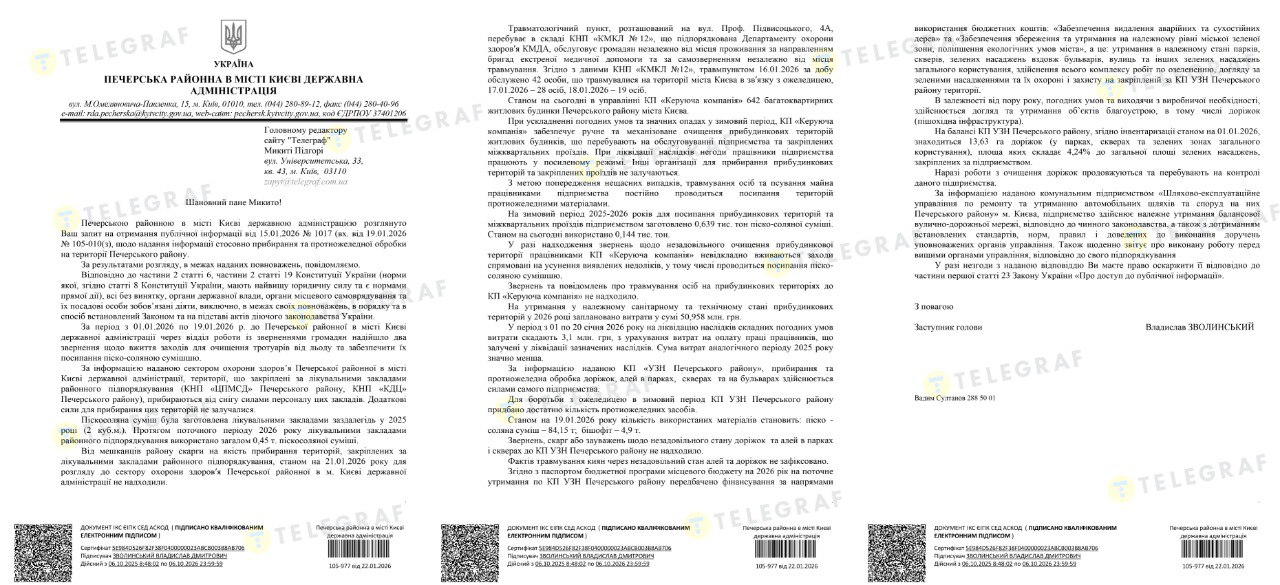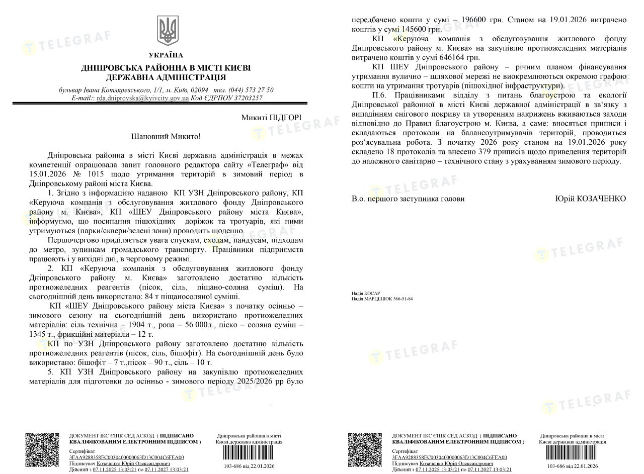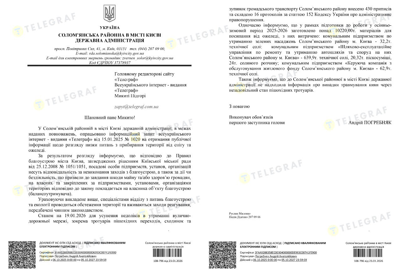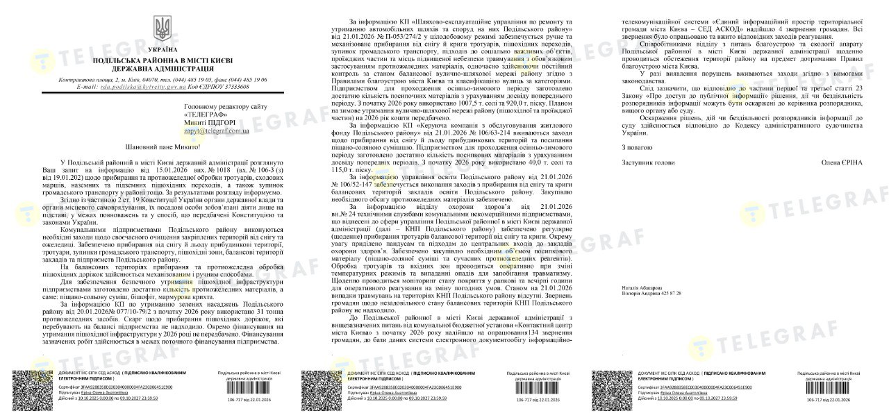 "Телеграф" поинтересовался у КГГА и районных администраций, как организована уборка и противогололедная обработка пешеходных зон.