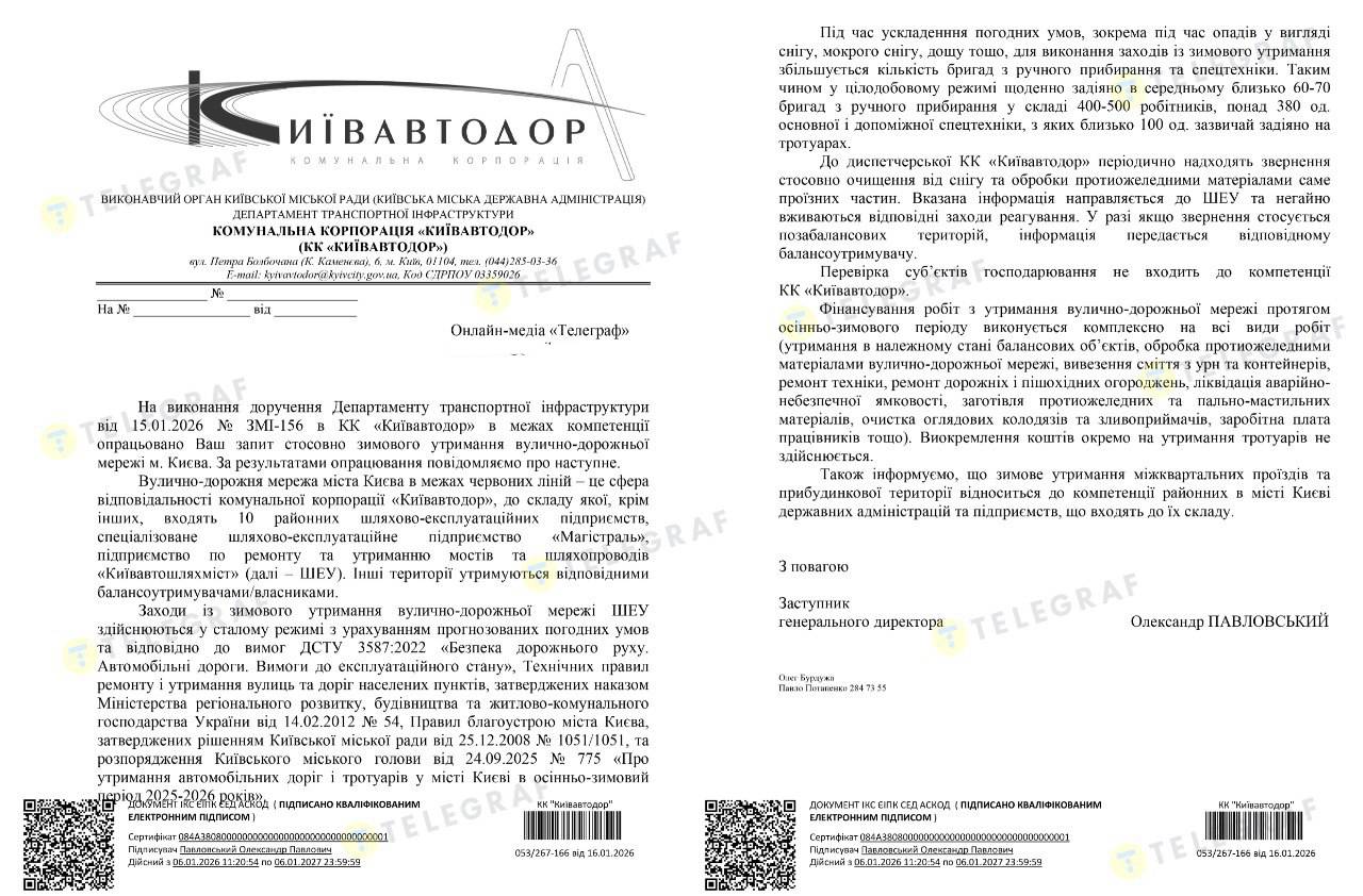 На вопрос, получал ли "Киевавтодор" нарекания от киевлян на свою работу, в ответе только констатировали: "в диспетчерскую УК периодически поступают обращения по очистке от снега и обработке противогололедными материалами именно проезжих частей ". Эту информацию тут же передают в районные ШЭУ, которые должны отреагировать, или если территория не находится в зоне контроля корпорации – балансодержателям.