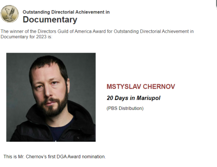 Хорошие новости пришли из США! Украинский режиссер Мстислав Чернов, создавший номинированный на "Оскар 2024" фильм о последствиях нападения России на Украину под названием "20 дней в Мариуполе", получил премию Гильдии режиссеров США (DGA Awards) за документальную ленту.