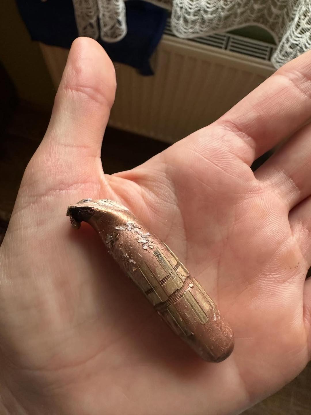 По словам военного Артура Аминева, часть ракет, которыми 5 октября Россия ударила по Львову, имела осколочные боеголовки. Некоторые из них взрывались прямо в воздухе. На фото ниже показан один из обломков ракеты Х-101. Как отмечает автор снимка, он выковырял этот металлический кусок из стены дома.