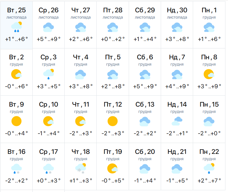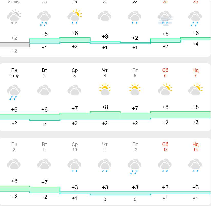 По данным сайта Meteofor, мокрый снег с дождем во Львове начнется уже 10 декабря и продлится 6 дней. В то же время в таблице даже в эти дни отсутствуют отрицательные температуры – в самые холодные ночи ртутные столбики остановятся на нулевой отметке.