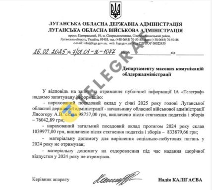 Об этом говорится в ответе Луганской ОВ на запрос "Телеграфа". Там привели информацию о должностном окладе главы Луганской ОВА Артема Лысогора. В частности, в январе 2025 составил 76 042 гривен.