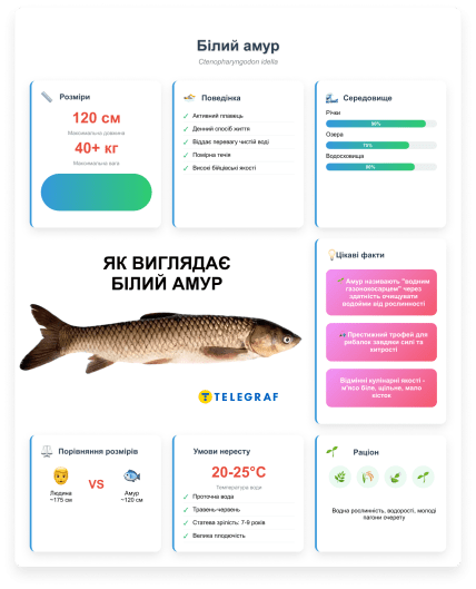 Размеры и вес: Белый амур может достигать длины до 120 см и веса более 40 кг. Семикилограммовый экземпляр, пойманный в Ровно, хотя и не рекордный, все же считается солидным трофеем.