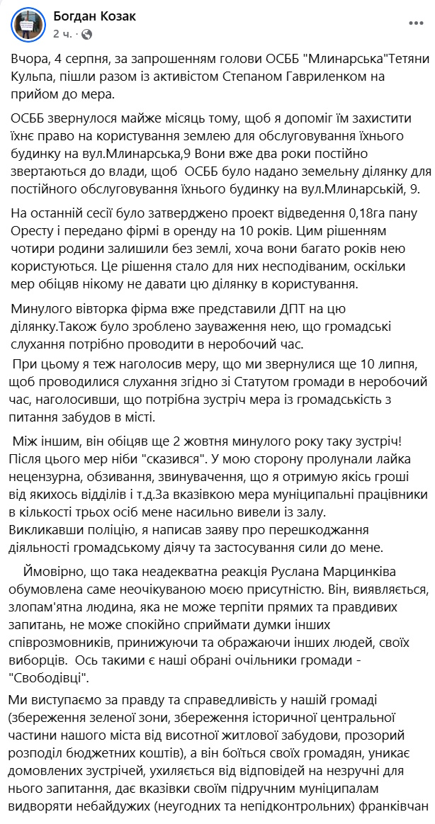 Видео ссоры показал в своем Facebook местный активист Богдан Козак, который и вызвал немилость мэра. Причиной встречи была попытка главы ОСМД "Млынарская" Татьяны Кульпы защитить право на использование участка под домом, поскольку его передали одной фирме в аренду на 10 лет.