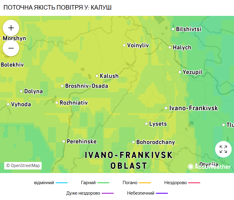 Согласно данным "AccuWeather", по состоянию на 3 сентября, текущий индекс качества воздуха в Калуше составляет 48, что соответствует категории "хороший". Это означает, что в целом воздух подходит для большинства людей, однако чувствительные лица могут испытывать незначительные или умеренные симптомы от длительного воздействия загрязнения.