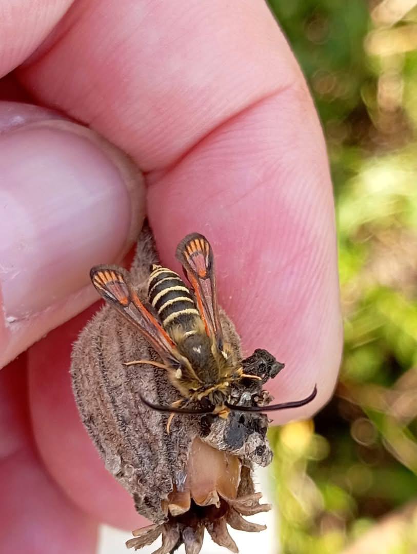 На фотографиях видно необычное насекомое с прозрачными крыльями, на которых отчетливо просматриваются оранжевые и черные полосы. Тело бабочки имеет характерную черно-желтую полосатую окраску, что делает его очень похожим на осу.