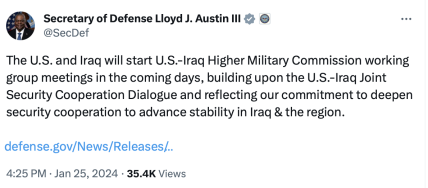 "США и Ирак начнут заседание рабочей группы Высшей военной комиссии США и Ирака в ближайшие дни, опираясь на Совместный диалог США и Ирака о сотрудничестве в сфере безопасности и отражая наше обязательство углубить сотрудничество в сфере безопасности для содействия стабильности в Ираке и регионе", — написал Остин.