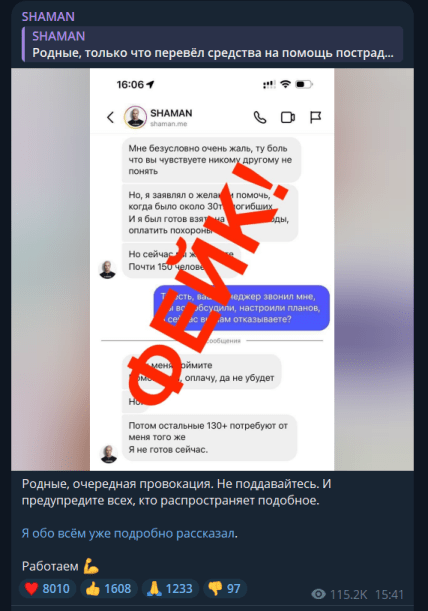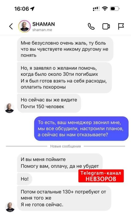 Российский пропутинский певец-пропагандист Ярослав Дронов, более известный под псевдонимом Shaman, активно эксплуатирующий в своих клипах нацистскую стилистику, якобы обманул пострадавших от теракта в "Крокус Сити Холле" россиян. Дронов обещал оплатить лечение для пострадавших и похороны для погибших, однако появились скриншоты переписки, в которой он якобы "дал заднюю", когда узнал количество жертв в концертном зале.