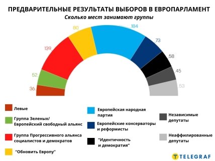 Коалиция групп (проукраинская), существовавшая в прошлые пять лет, сохраняет свое преимущество. Центристская Европейская народная партия (ЕНП) станет самой большой политической группой в новом созыве; вместе с либеральной "Обновить Европу" (Renew Europe) и социал-демократами (S&D) у них будет примерно 403 из 720 мандатов.