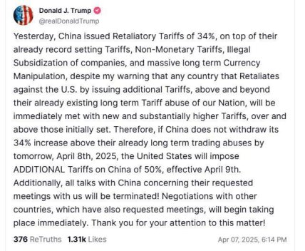 "Китай ввел 34% пошлины в дополнение к уже установленным им рекордным пошлинам, незаконному субсидированию компаний и масштабным долгосрочным валютным манипуляциям, несмотря на мое предупреждение о том, что любая страна, которая введет дополнительные пошлины в ответ и в дополнение к уже существующим долгосрочным таможенным злоупотреблениям по нашим высшими пошлинами, превышающими изначально установленные.