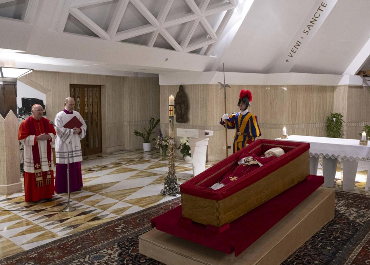 Ватикан обнародовал первые фотографии покойного Папы Франциска, покоящегося в простом открытом гробу. На фото видно, что тело понтифика окружают швейцарские гвардейцы и представители высшего духовенства.