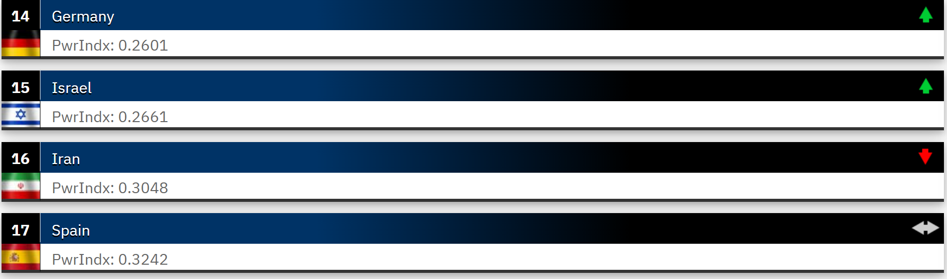Согласно Индексу военной силы сайта Global Fire Power за 2025 год, Армия Израиля занимает 15-е место среди 145 армий мира. Иранская армия занимает 16-е место.