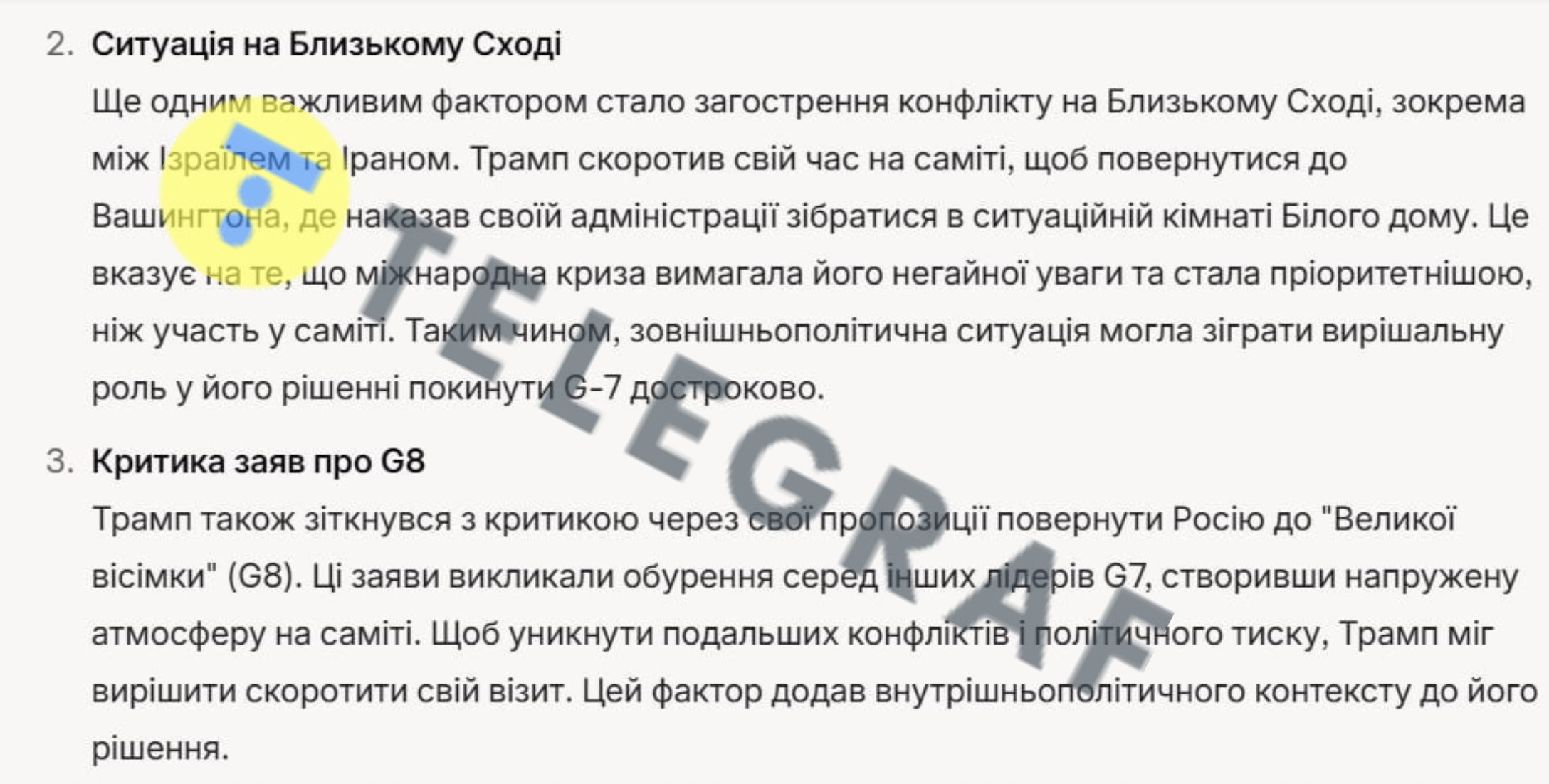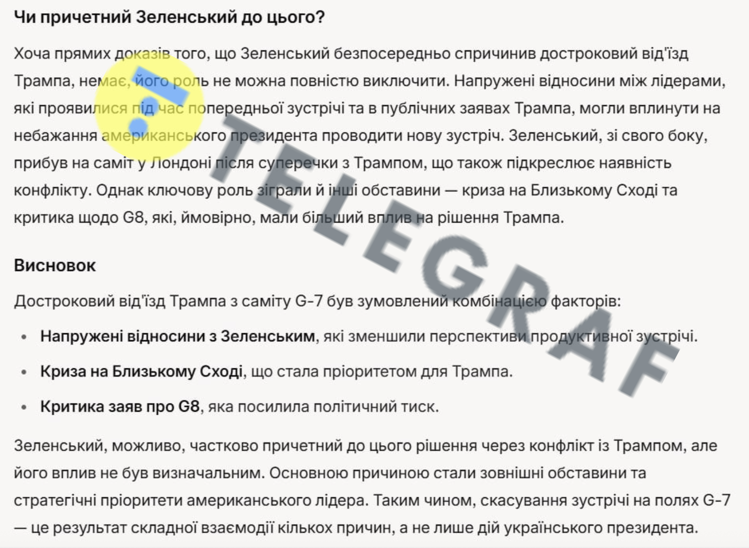Grok считает, что такие действия Трампа вызваны совпадением нескольких факторов, в частности напряженными отношениями между главой США и Зеленским, ситуацией на Ближнем Востоке и критикой заявлений Трампа относительно G8. То есть присутствие президента Украины не могло стать основной причиной "бегства Трампа".