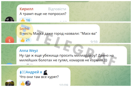 "А Трамп еще не попросил?", "В честь Маска даже город назвали: "Маск-ва", "Ну где еще убежища просить миллиардеру? Давно на милых болотах не гулял, комаров не кормил" "Что они там все курят", — пишут в сети.