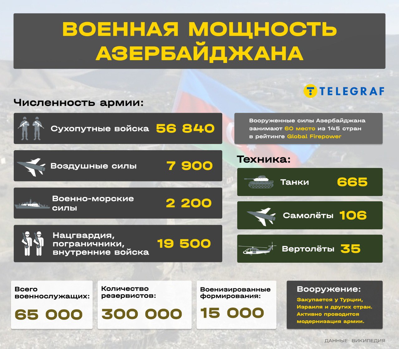 По данным аналитиков, в распоряжении Азербайджана есть 665 боевых танков, 106 самолетов и 35 вертолетов. Страна активно модернизирует армию, закупая современное вооружение у Турции, Израиля и других стран.