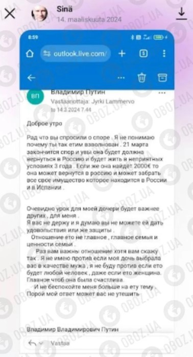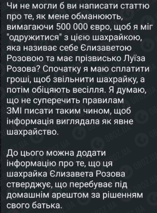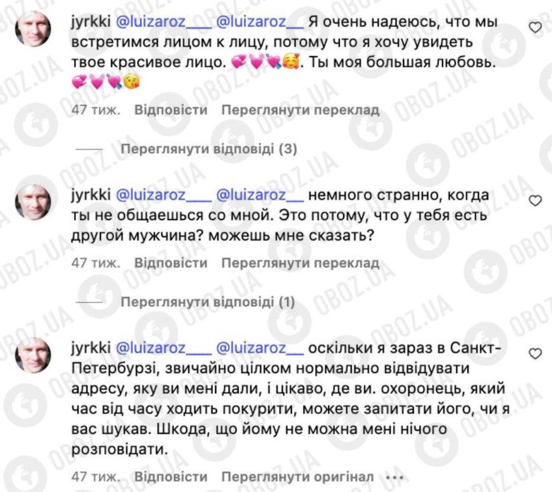 Финн хотел разместить на сайте OBOZ.UA историю о своем "романе" с дочерью главы Кремля. По его словам, любовная переписка с Луизой Розовой началась примерно год назад. Девушка якобы попала ему на глаза в интернете и охотно отвечала взаимностью на чувства довольно таки старшего мужчины.