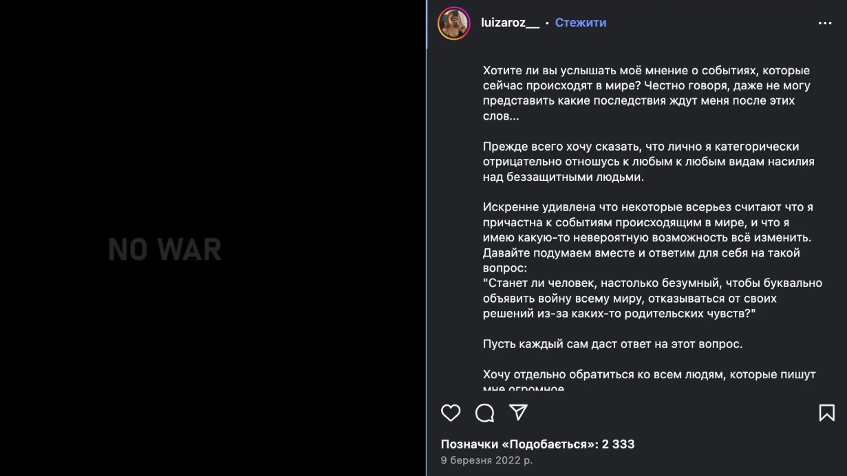 9 марта 2022 года в Instagram-аккаунте, приписываемом внебрачной дочери главы Кремля, появился антивоенный призыв. Сообщение заканчивалось риторическим вопросом: "Станет ли человек, столь безумный, чтобы буквально объявить войну всему миру, отказываться от своих решений из-за каких-то родительских чувств?"