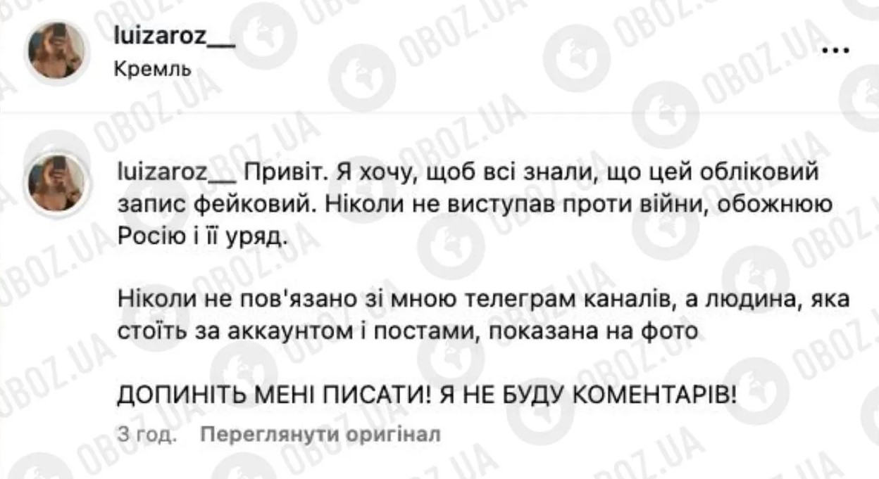 Однако 6 августа ситуация окончательно прояснилась. Все предыдущие посты исчезли со страницы, а вместо них появилось фото с лицом главы РФ и заявлением: "Я хочу, чтобы все знали, что этот аккаунт фейковый. Я никогда не выступал против войны, я обожаю Россию и ее правительство. Со мной никогда не было связано никаких телеграмм-каналов, а человек, который стоит за этим, на фото".