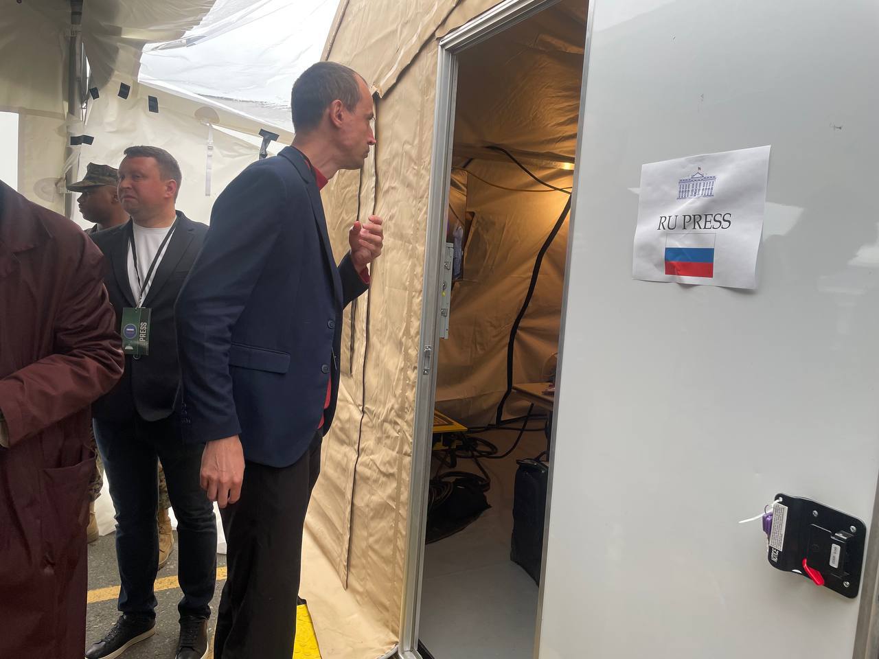 Пресс-центр, которая предложила им принимающая сторона выглядит как подсобное помещение. На стене сбоку от двери криво наклеен помятый листок с изображением российского флага и надписью RU PRESS.