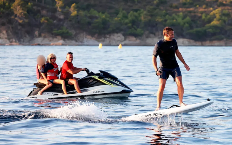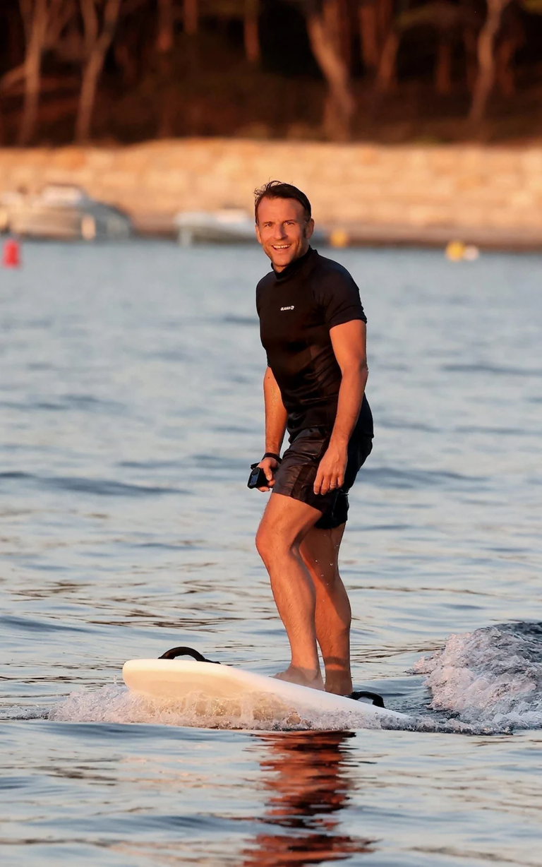 Надо сказать, что много внимания в западной прессе уделили виду Эммануэля Макрона на отдыхе. Он катался на доске для серфинга при этом был в специальном наряде для плаванья. И это очень контрастирует с его привычным деловым образом. Тем временем Брижит развлекалась с внуками на водном мотоцикле.