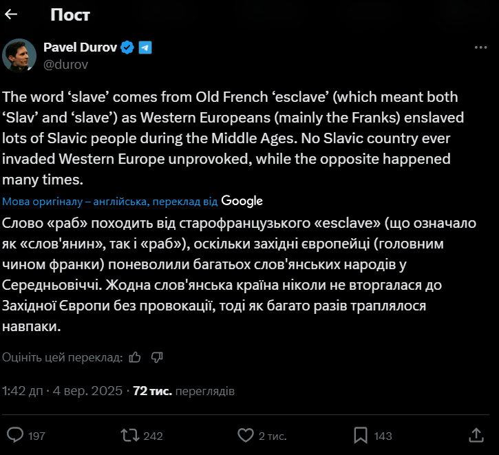 Отвечая на пост Илона Маска об английском слове "slave", Дуров отметил, что оно якобы произошло от старофранцузского "esclave", одновременно обозначавшего "славянин" и "раб". По его словам, в средние века западноевропейцы, в частности франки, часто порабощали славянские народы, тогда как эти страны никогда безосновательно не вторгались на территорию Западной Европы.