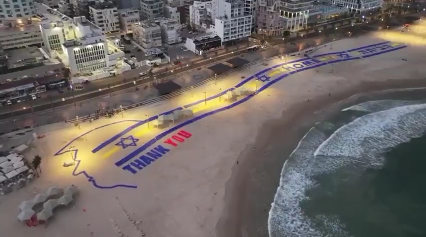 На фоне его приезда на пляже в Тель-Авиве появился гигантский знак с приветствием и благодарностью американскому президенту, а на постройках в Иерусалиме разместили большие баннеры в его честь.