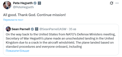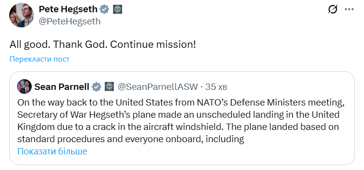 "На обратном пути в Соединенные Штаты с заседания министров обороны НАТО самолет военного министра Хегсета совершил внеплановую посадку в Великобритании из-за трещины на лобовом стекле. Самолет приземлился в соответствии со стандартными процедурами, и все на борту, включая министра Хегсета, в безопасности", — прокомментировал случай помощник главы министерства войны по связям с общественностью Шон Парнелл.
