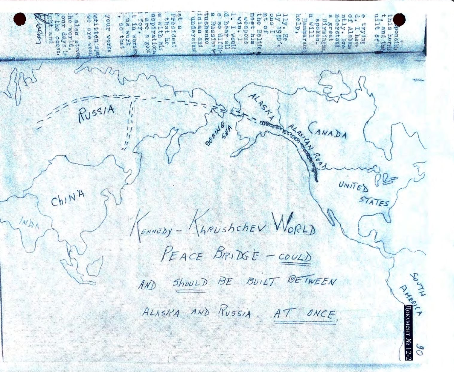 Дмитриев очень тщательно все продумал — он добавил к публикации карту, где должен проходить туннель между Чукоткой и Аляской. В публикации, сделанной несколько раньше, он напомнил, что в советское время существовал план создания подобного моста, тогда его называли мостом Кеннеди-Хрущева. Речь идет о 35-м президенте США Джоне Кеннеди и главе СССР Никите Хрущеве, которые тогда были у власти в своих странах.