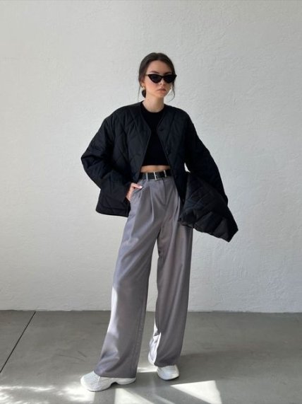 Эта куртка однозначно тренд 2024 года. Дополнить ее можно джинсами с кедами или спортивным костюмом с ботинками.