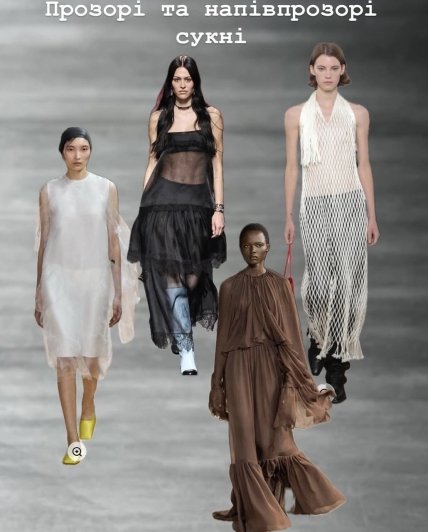 Врываются в тренды и полупрозрачные платья. Они заполонили сердца всех модниц еще в 2023, а в этом году набирают снова популярность. Возвращается также мода 90-х. Минималистичные платья в этом стиле будут особенно актуальны.
