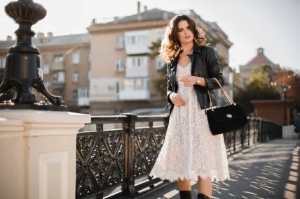 Мойя Мохинни предстала в белой кружевной юбке ассиметричной формы, дополнив ее кожаным бомбером и сапогами с острым носом. Она дополнила образ черной кожаной сумкой и украшениями золотого оттенка.