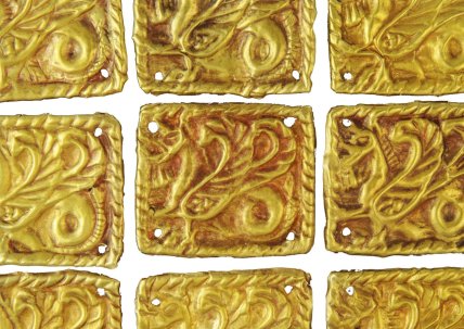 Одному из этих воинов было 15-16 лет и был он похоронен в торжественном наряде, обшитом золотыми аппликациями, на шее – золотая гривна с изображением головы грифона на концах, на правой руке – серебряный браслет, на ногах – серебряные поножи и пояс, украшенный золотыми пластинками, которых было 99 штук квадратной формы двух типов – с изображениями драконов (75) и растительного мотива (24).