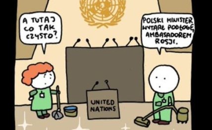 Министр иностранных дел Польши Радослав Сикорский установил в своем кабинете карикатуру на постоянного представителя России в ООН Василия Небензю. На изображении уборщица здания ООН спрашивает коллегу: "Почему здесь так чисто?", а тот отвечает: "Польский министр вымыл пол российским послом".