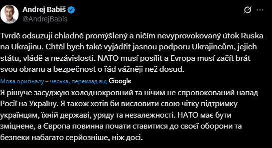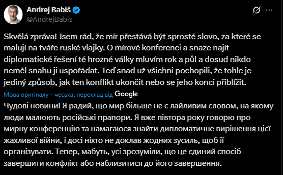 Бабиш неоднократно подчеркивал, что Украина "не готова к членству в ЕС" и что к началу каких-либо переговоров об интеграции следует закончить войну. Еще летом 2025 года он официально выступал против помощи украинским беженцам, заявляя, что из-за нее поддержку не получают чешские семьи.