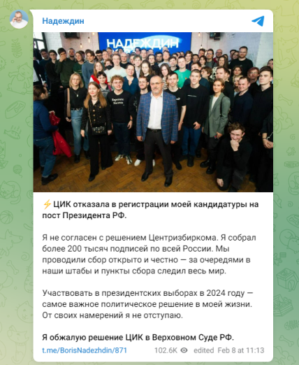 Надеждин уже отреагировал на решение ЦИК. Он заявил, что не согласен с ним и будет обжаловать в Верховном Суде РФ.