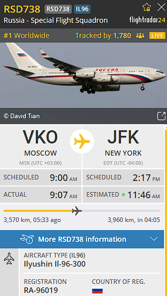 Информация о рейсе отображена на сайте flightradar24. Самолет вылетел из Москвы в 9 часов утра по Московскому времени. В Нью-Йорке воздушное судно должно сесть около 19 часов вечера по Киевскому времени. В США это будет около часа дня.