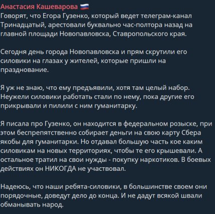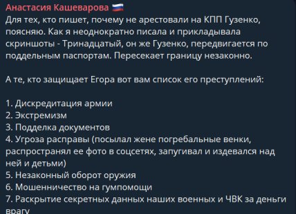 Еще одна "Z-блогерша" Анастасия Кашеварова утверждает, что Гузенко находится в федеральном розыске и в боевых действиях якобы не участвовал. Она пишет, что в России "Тринадцатому" инкриминируют "дискредитацию армии", подделку документов, мошенничество на гуманитарной помощи, экстремизм, угрозы членам семьи, незаконный оборот оружия и передачу Силам обороны Украины данных о месте пребывания подразделений ВС РФ и ЧВК "Вагнер" за деньги.