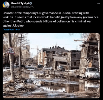 Представитель Министерства иностранных дел Украины Георгий Тихий высказал предложение о введении временного управления ООН в России, начиная с города Воркута.
