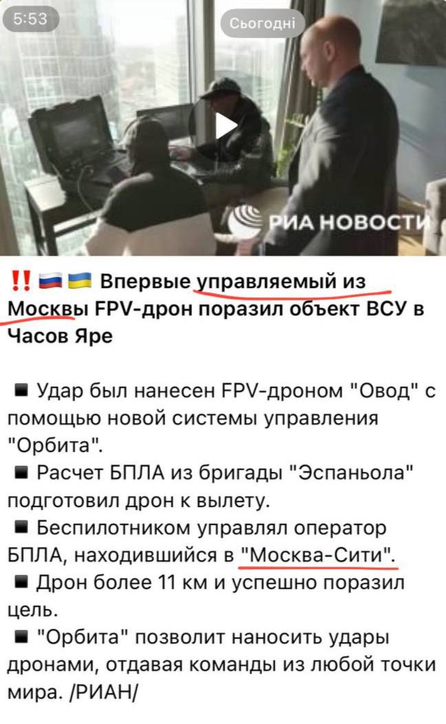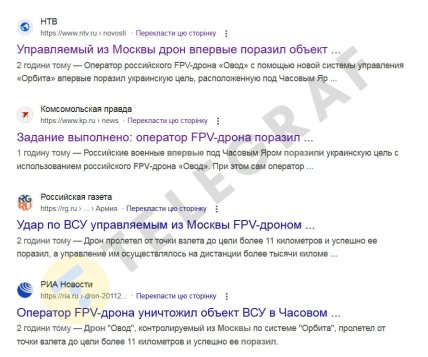 "Впервые FPV-дроны, которыми управляли из Москвы, поразили объект ВСУ во Временном Яру", — говорилось в сообщении.