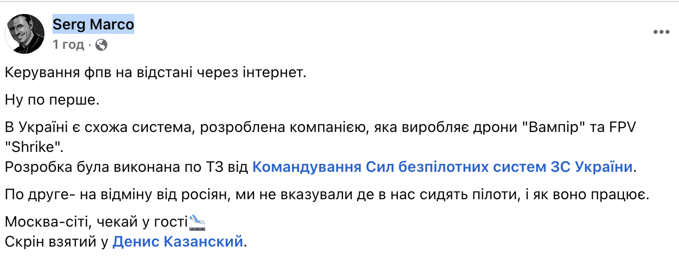 Однако, как написал военнослужащий ВСУ, аэроразведчик Александр Карпюк (Серж Марко), в Украине также есть похожая система, разработанная компанией, производящей дроны "Вампир" и FPV "Shrike".