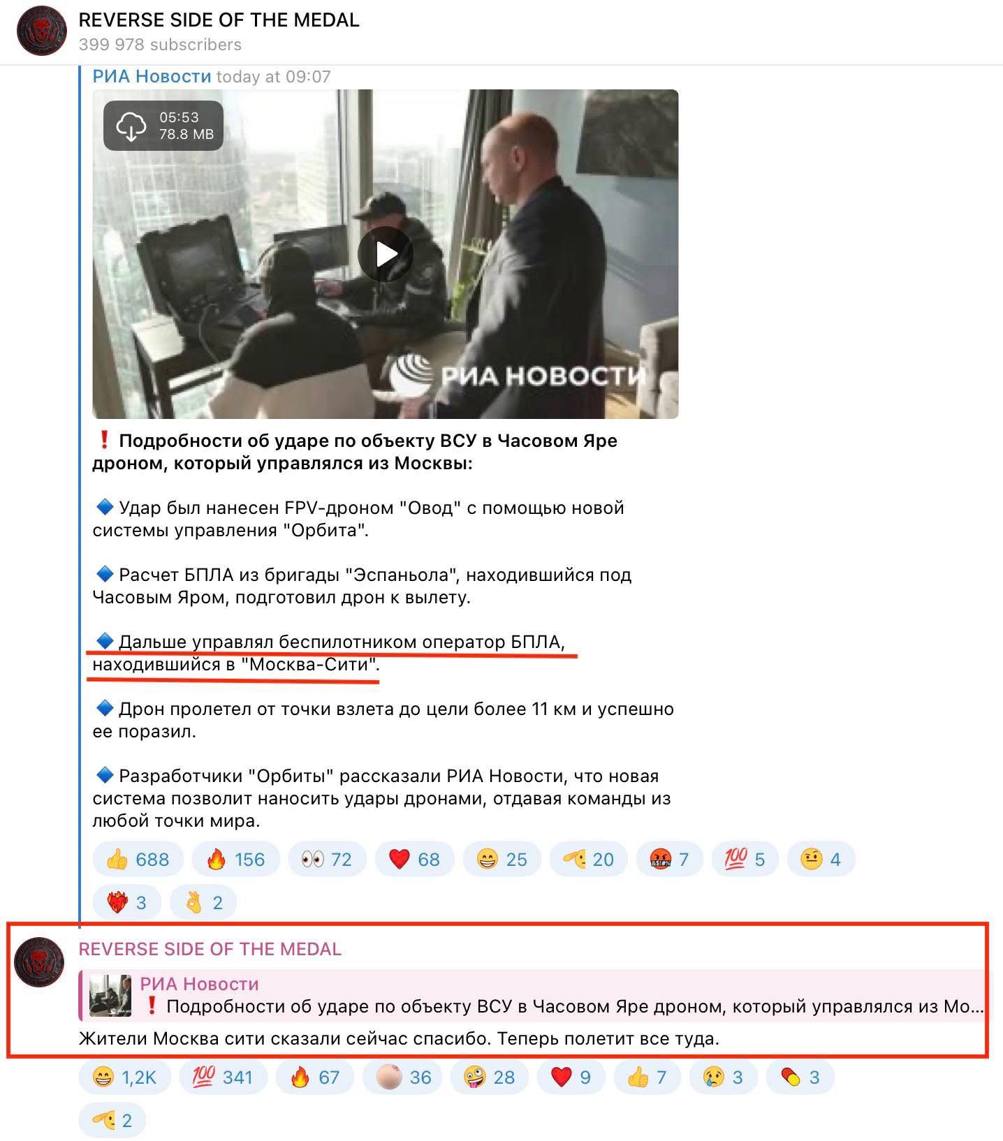 Российские СМИ опубликовали информацию о расположении базы своих дроноводов в Москве, с которой атаковали Часов Яр. Она была размещена в международном деловом центре "Москва-Сити", в который уже несколько раз попадали украинские БПЛА.