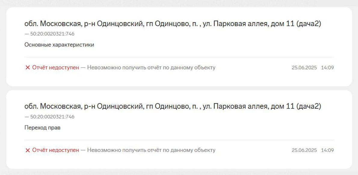 Как сообщают российские СМИ, вместо выписки из реестра пользователь получает сообщение: "Невозможно получить отчет по данному объекту". Таким образом, данные о принадлежащем государству участке и доме стали недоступны для общественности.