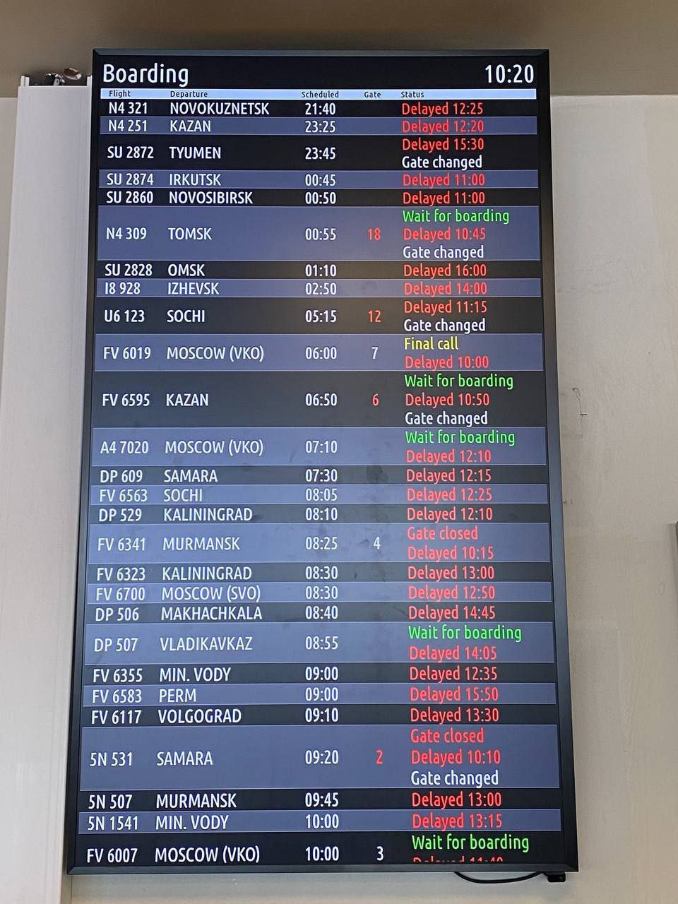 Во московских аэропортах ситуация менее напряженная: во Внуково задержано 4 рейса, в Домодедово — 11, а в Шереметьево — 37. Из-за задержек не редко можно увидеть картину, что россияне спят прямо на полу аэропорта, а в некоторых случаях поступали жалобы, что даже запасы платного алкоголя подходят к концу.
