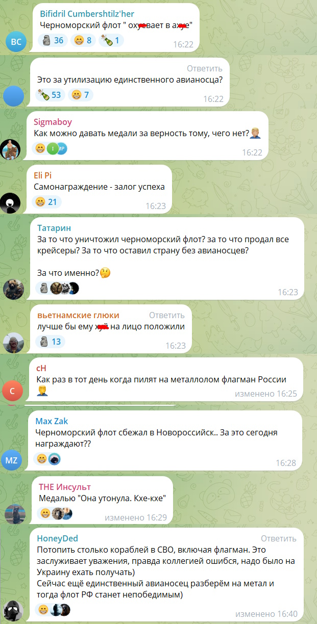 Пользователей сети в то же время удивило то, что Путину дают медаль, в то время как Черноморский флот вынужден сбежать из оккупированного Крыма в Новороссийск, а единственный авианесущий крейсер "Адмирал Кузнецов" отправляют на металлолом. Нашлись и те, кто вспомнил о судьбе подлодки "Курск" и предложил наградить диктатора медалью "Она утонула".