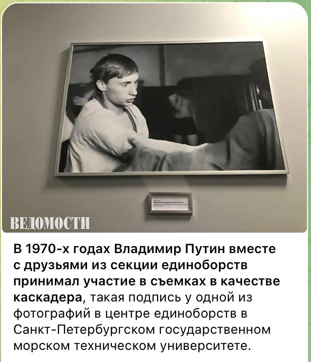 "В 1970-х годах Владимир Путин принимал участие в съемках фильмов как каскадер, говорится в подписи к одной из фотографий, висящей в центре единоборств в Санкт-Петербургском государственном морском техническом университете (известный как "Корабелка")", — говорится в материале.