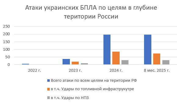 За 8 месяцев 2025 года ВСУ нанесли 74 удара по объектам топливной инфраструктуры, в том числе, 30 (!) ударов по НПЗ. Причем почти 50% прилетов по НПЗ пришлись на август.